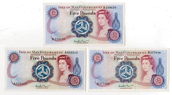 Isle of Man, Lot of 3 notes, All are £5, P-30b, Signature 3, Issued banknotes, Blue-black and m/c, Queen Elizabeth II at right, Triskele Arms middle, Signature title: Lieutenant Governor, All are in Choice VF condition with large even margins, bright colors, sharp corners, and Crisp fresh appearance. BWC.