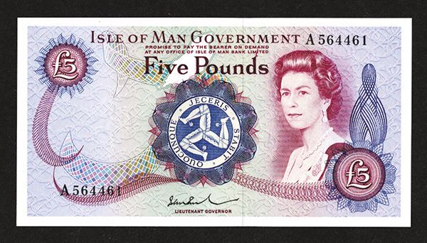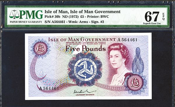 Isle of Man, £5, P-30. Elizabeth II at right, Signature 3, Rushen Castle on back, PMG graded Superb Gem Unc. 67 EPQ. Rarely seen this nice.