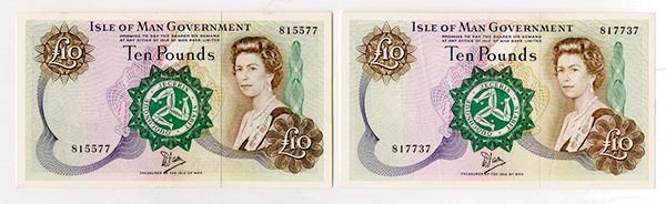 Isle of Man, Lot of 2 notes, Both are £10, P-36a, With prefix A, Signature 5, Issued banknotes, Brown and dark green on m/c, Queen Elizabeth II at right, Triskele Arms middle, Signature title: Lieutenant Governor, Both are in Choice VF condition with large even margins, bright colors, sharp corners, and Crisp fresh appearance. BWC.