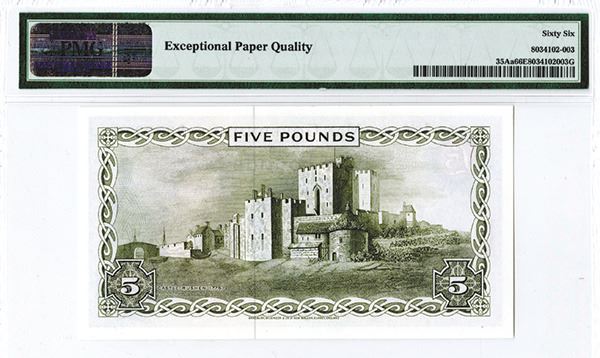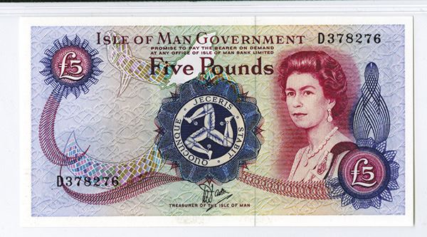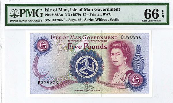 Isle of Man, 1979 ND Issue, Treasurer signer. £5, P-35Aa, Prefix D without serif, S/N D378276. PMG graded Gem Uncirculated 66 EPQ with only one note grading higher out of 7 graded.