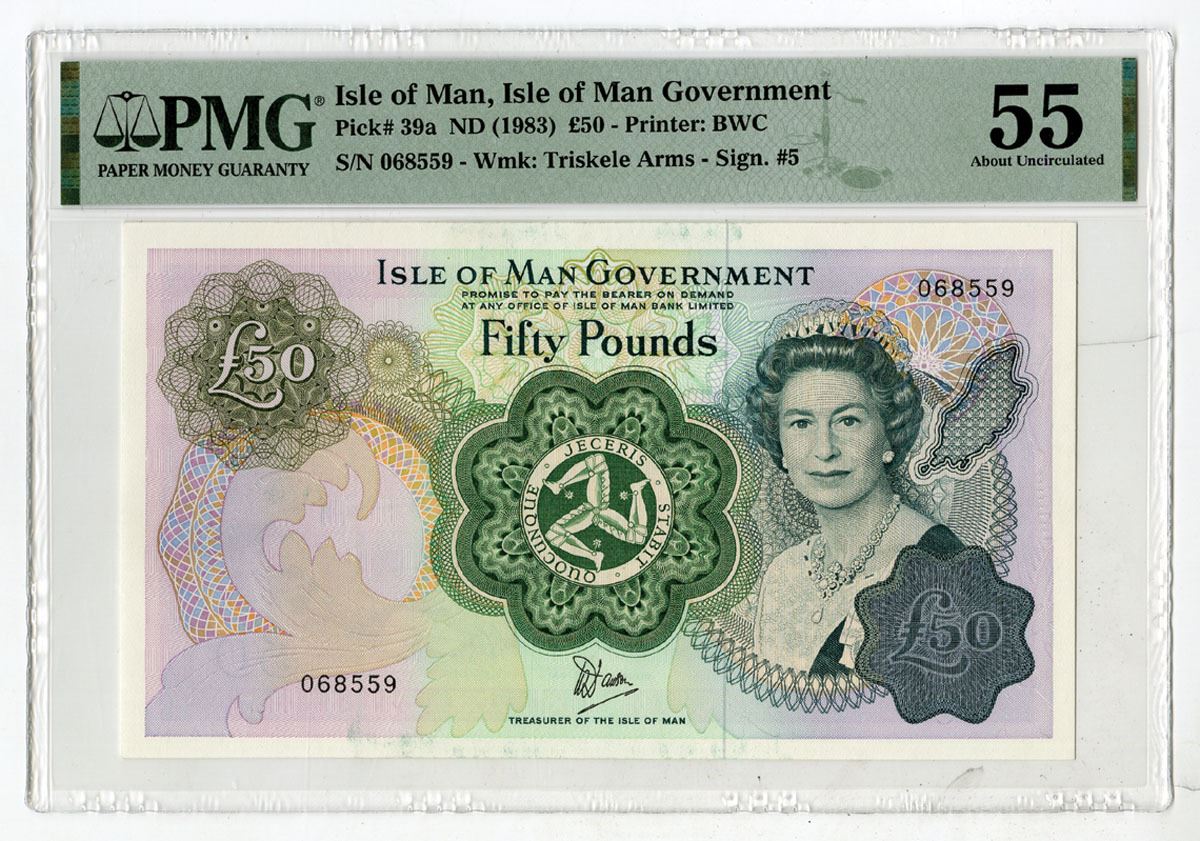Isle of Man, ND (1983). 50 Pounds, P-39a, Issued Banknote, Dark green on m/c underprint with Portrait of Queen Elizabeth II at right, Back is m/c with view of Douglas Bay at center, S/N 068559, PMG graded About Uncirculated 55, BWC.