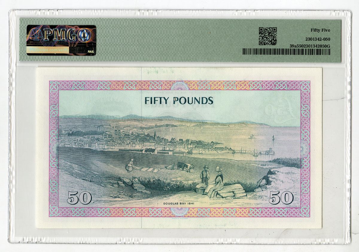 Isle of Man, ND (1983). 50 Pounds, P-39a, Issued Banknote, Dark green on m/c underprint with Portrait of Queen Elizabeth II at right, Back is m/c with view of Douglas Bay at center, S/N 068559, PMG graded About Uncirculated 55, BWC.