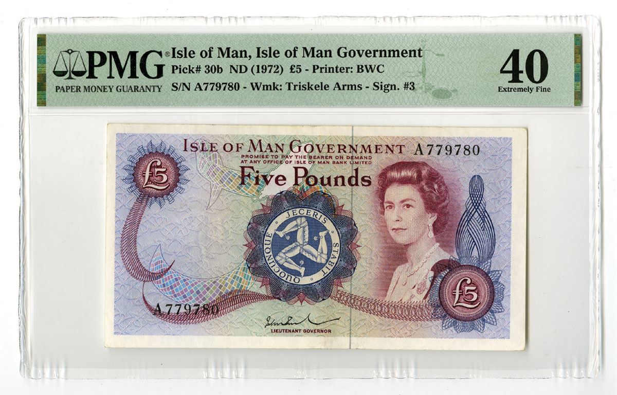 Isle of Man, ND (1972).5 Pounds, P-30b, Issued Banknote, Blue-black and m/c printing with Queen Elizabeth II at right, Triskele Arms in middle, Signature title: Lieutenant Governor, S/N A779780, PMG graded Extremely Fine 40, BWC.