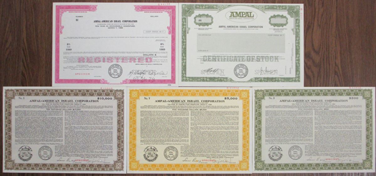 Israel and U.S., Lot of 5 Specimen certificates, Includes: Odd Shares Specimen 6.5% Cumulative Convertible Preferred Stock Certificate in olive; $Odd Specimen 8% Registered Redeemable Debenture Bond in pink; $500 Specimen 8% Sinking Fund Debenture Coupon Bond in olive; $5000 Specimen 8% Sinking Fund Debenture Coupon Bond in yellow; $10,000 Specimen 8% Sinking Fund Debenture Coupon Bond in brown. All are in AU-Unc. condition. Ampal-American Israel Corporation was a New York unit of Israel's Bank Hapoalim. It was a holding company that primarily acquired interests in Israel-related businesses. (5)