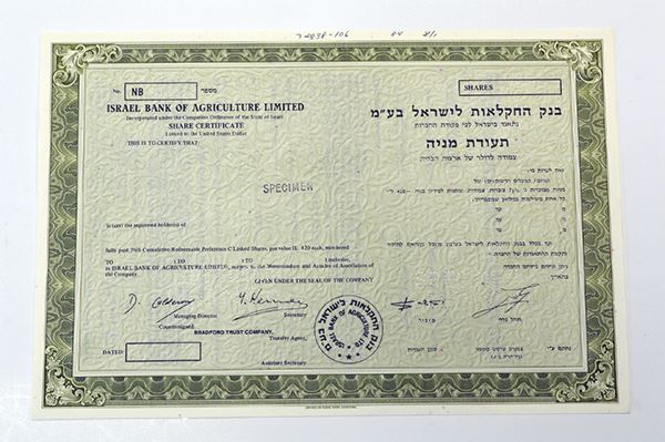 Israel. -Odd Shrs Stock Certificate Specimen. Hebrew and English text. ABNC. Extremely Fine.