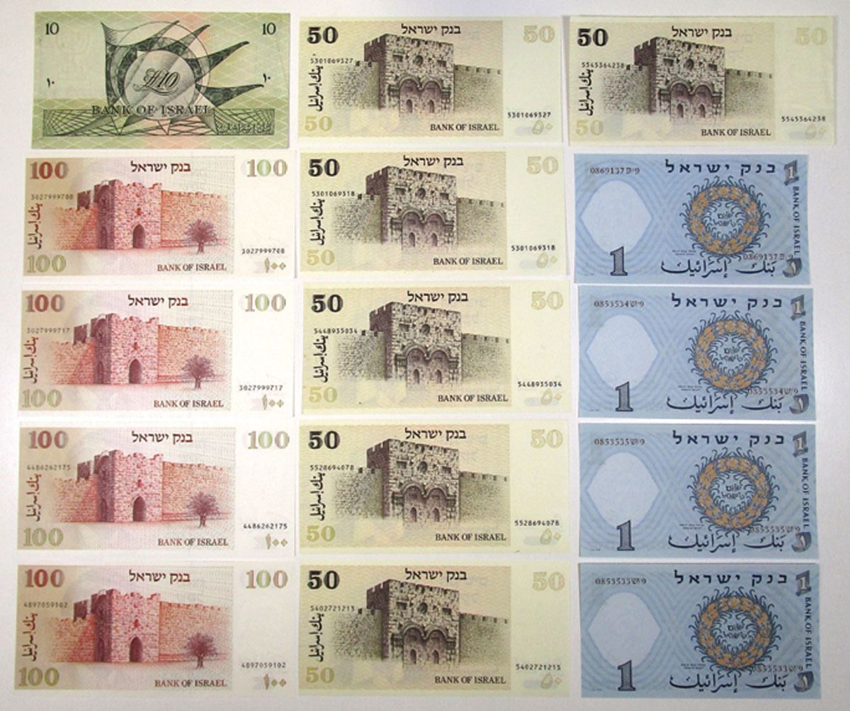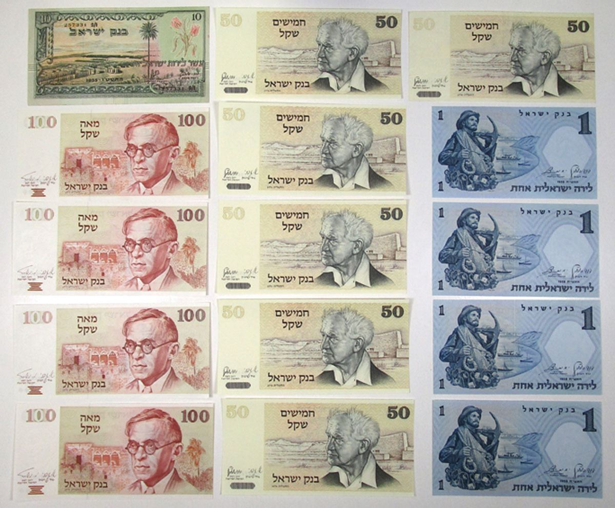 Israel.., 1955 to 1979. Lot of 15 Issued Banknotes, Includes: 1955/5715 10 Lirot, P-10b, TDLR; 1958/5718, 1 Lira, P-30c (4), JEZ; 1978/5738, 50 Sheqalim, P-46a (6), JEZ; 1979/5739, 100 Sheqalim, P-47a (4), JEZ. Notes range from XF to CU condition with most being Choice AU to Uncirculated. (15). Sold "AS IS" no returns accepted.