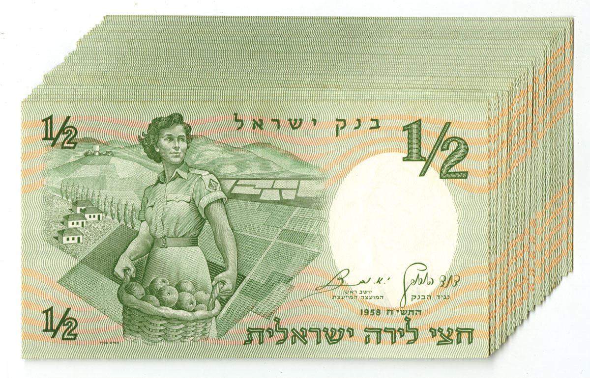Israel, 1958. 1/2 Lira, P-29a (29), Issued Banknote Assortment, Green on green and peach underprint, Female soldier with basket of oranges at left, Back is green and orange with tombs of the Sanhedrin at right, Some notes are in sequential order, Condition ranges from XF to AU. JEZ. (29). Sold "AS IS" no returns accepted.