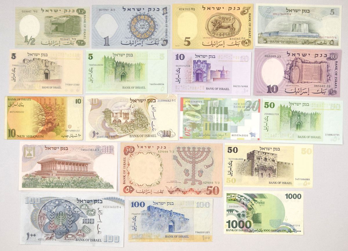 Israel......., 1958-2008. Lot of 18 Issued Banknotes, Includes: 1958, 1/2 Lira, P-29a, JEZ; 1 Lira, P-30, JEZ; 5 Lirot, Pick-31a, TDLR; 10 Lirot, P-32a, TDLR; 1960, 50 Lirot, P-33d, JEZ; 1968, 5 Lirot, P-34b, JEZ; 10 Lirot, P-35c, JEZ; 50 Lirot, P-36b, JEZ; 100 Lirot, P-37d, JEZ; 1973, 5 Lirot, P-38, JEZ; 10 Lirot, P-39a, JEZ; 50 Lirot, P-40, JEZ; 100 Lirot, P-41, JEZ; 1978, 5 Sheqalim, P-44, JEZ; 1978 (1980), 50 Sheqalim, P-46a, JEZ; 1983, 1000 Sheqalim, P-49b, JEZ; 1985, 10 New Sheqalim, P-53a, JEZ; 2008. 20 New Sheqalim, P-63. Notes range from VF to UNC condition. (18). Sold "AS IS" no returns accepted.