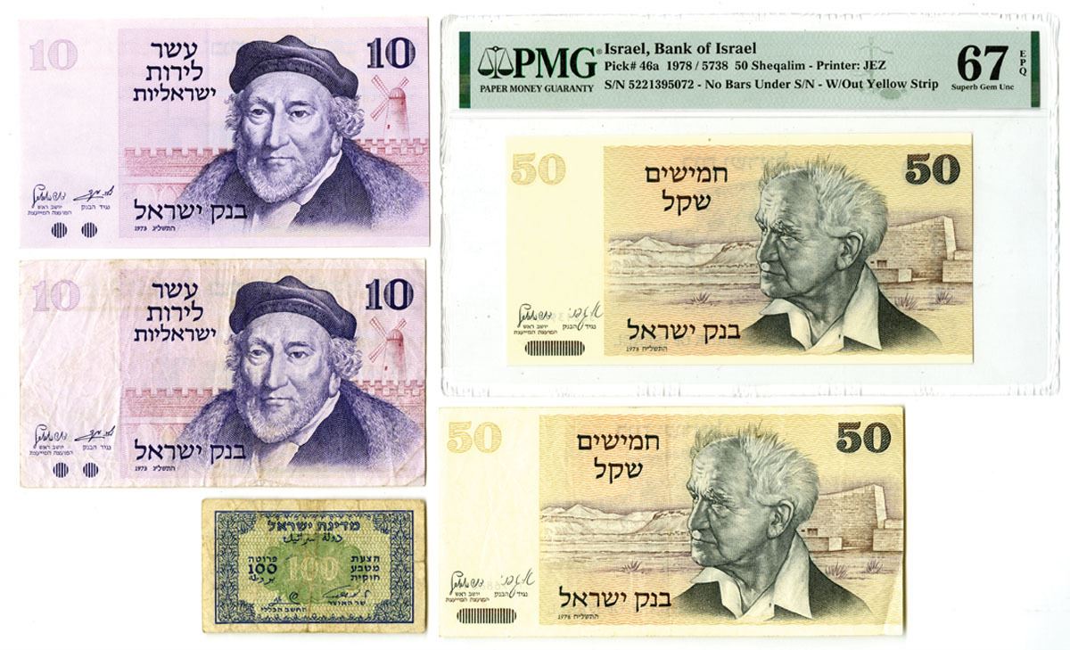 Israel, 1973-78. Lot of 5 Issued Banknotes, Includes: Israel Government, ND (1952), 100 Pruta, P-12c; Bank of Israel, 1973, 10 Lirot, P-39a (2); 1978, 50 Sheqalim, P-46a (2) - 1 is PMG graded Superb Gem Unc 67 EPQ. Notes are in Fine to UNC condition. (5). Sold "AS IS" no returns accepted.