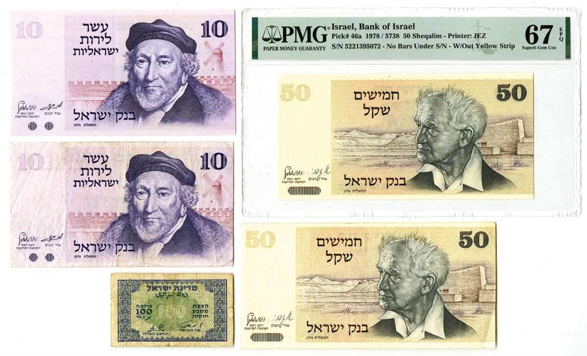 Israel, 1973-78. Lot of 5 Issued Banknotes, Includes: Israel Government, ND (1952), 100 Pruta, P-12c; Bank of Israel, 1973, 10 Lirot, P-39a (2); 1978, 50 Sheqalim, P-46a (2) - 1 is PMG graded Superb Gem Unc 67 EPQ. Notes are in Fine to UNC condition. (5). Sold "AS IS" no returns accepted.