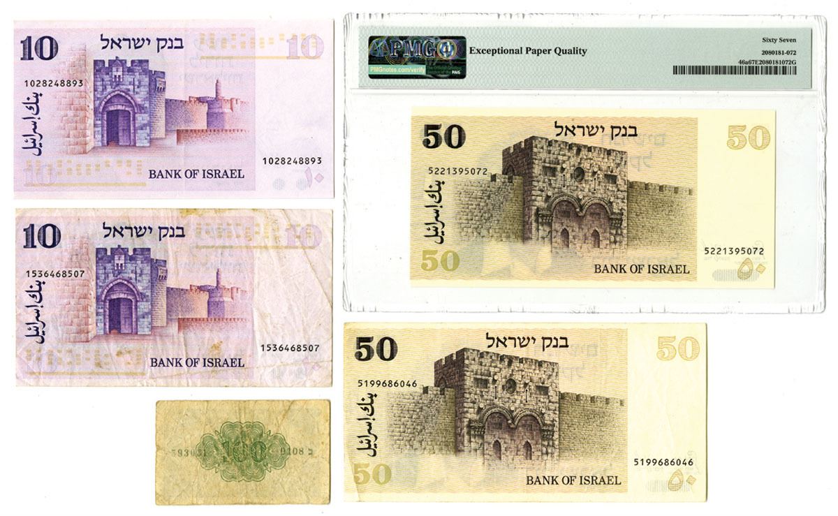 Israel, 1973-78. Lot of 5 Issued Banknotes, Includes: Israel Government, ND (1952), 100 Pruta, P-12c; Bank of Israel, 1973, 10 Lirot, P-39a (2); 1978, 50 Sheqalim, P-46a (2) - 1 is PMG graded Superb Gem Unc 67 EPQ. Notes are in Fine to UNC condition. (5). Sold "AS IS" no returns accepted.