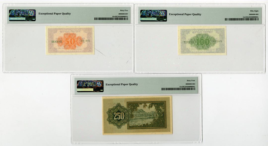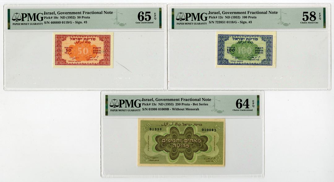 Israel, ND (1952-53). Lot of 3 Issued banknotes: 50 Pruta, P-10c, PMG graded Gem Uncirculated 65 EPQ; 100 Pruta, P-12c, PMG graded Choice About Uncirculated 58 EPQ; and 250 Pruta, P-13c, PMG graded Choice Uncirculated 64 EPQ. (3)