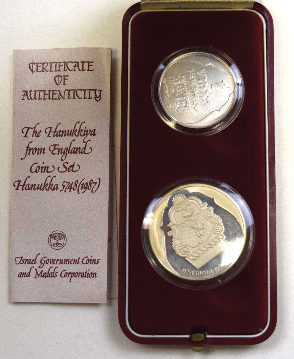 Israel, 1987. Two-coin silver set issued by the Bank of Israel and Israel Government Coins and Medals Corp. for Hanukkah, titled “Hanukkiya from England.” The set includes a 1 Sheqel coin struck in .850 fine silver, weighing 14.4 grams (30 mm), and a Proof 2 Sheqalim coin struck in .850 fine silver, weighing 28.8 grams (37 mm). Total weight is 43.2 grams, with a combined Actual Silver Weight (ASW) of 36.72 grams (1.18 troy oz) with a silver melt of $94 with silver at $80 per ounce. Coins are housed in the original red presentation case with certificate of authenticity.
