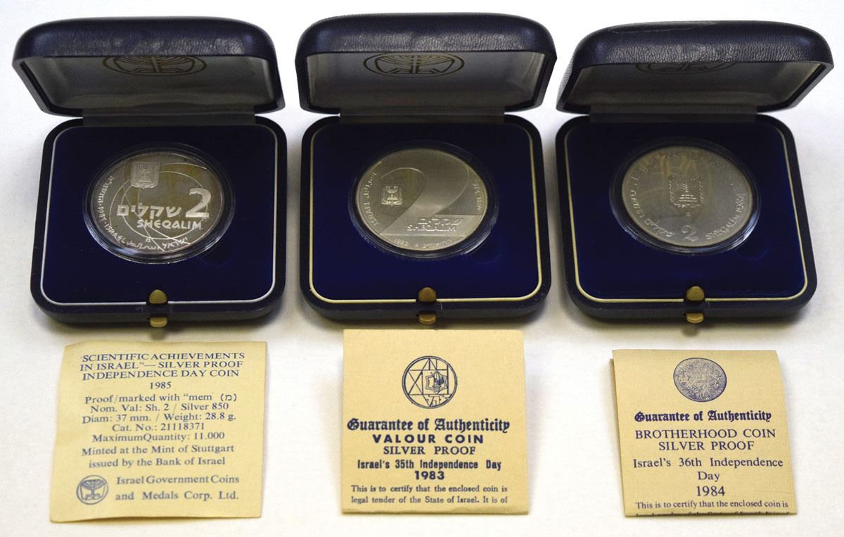 Israel, 1983-85. Lot of 3 Silver Proof Coins issued for Israel’s Independence Day commemorative series, including the 1983 “Valour Coin”, 1984 “Brotherhood Coin”, and 1985 “Scientific Achievements in Israel” issue, each housed in its original presentation case with certificate of authenticity. Coins have a 2 Sheqalim face value, struck in .850 fine silver, each weighing 28.8 grams with a 37 mm diameter. Total weight for the lot is 86.4 grams, with an Actual Silver Weight (ASW) of 73.44 grams for all 3 coins, (2.36 Troy Ounces of silver) with a total Silver Melt of $189. (3). Sold “AS IS” no returns accepted.