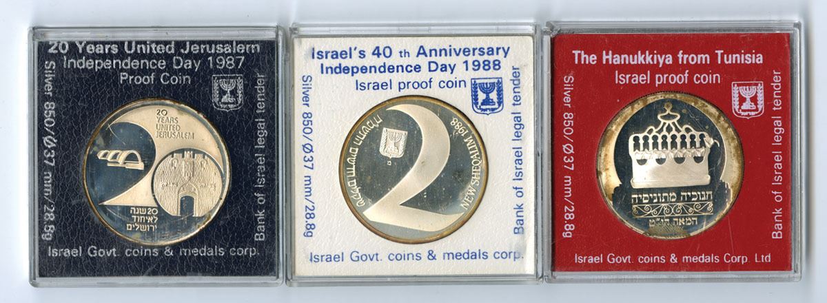 Israel, 1987-88. Lot of 3 Silver Proof Coins issued by the Bank of Israel and Israel Government Coins & Medals Corp., including “20 Years United Jerusalem” Independence Day (1987), “Hanukkiya from Tunisia” (1987), and Israel’s 40th Anniversary Independence Day (1988). Coins are struck in .850 fine silver, each weighing 28.8 grams with a 37 mm diameter. Total weight is 86.4 grams, with an Actual Silver Weight (ASW) of 24.48 grams per coin, totaling 73.44 grams (2.36 troy oz) of silver for the lot. Coins remain housed in their original government holders. (3). Sold “AS IS” no returns accepted.