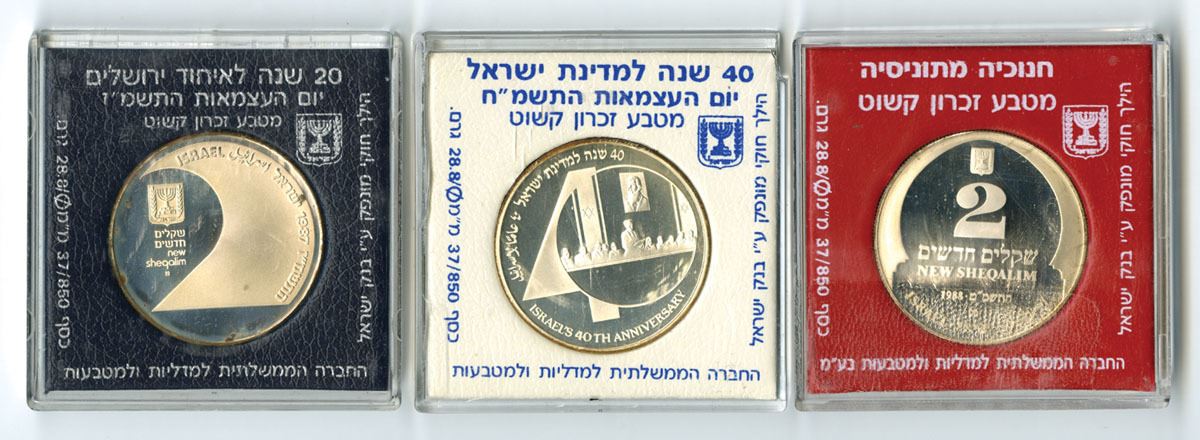 Israel, 1987-88. Lot of 3 Silver Proof Coins issued by the Bank of Israel and Israel Government Coins & Medals Corp., including “20 Years United Jerusalem” Independence Day (1987), “Hanukkiya from Tunisia” (1987), and Israel’s 40th Anniversary Independence Day (1988). Coins are struck in .850 fine silver, each weighing 28.8 grams with a 37 mm diameter. Total weight is 86.4 grams, with an Actual Silver Weight (ASW) of 24.48 grams per coin, totaling 73.44 grams (2.36 troy oz) of silver for the lot. Coins remain housed in their original government holders. (3). Sold “AS IS” no returns accepted.