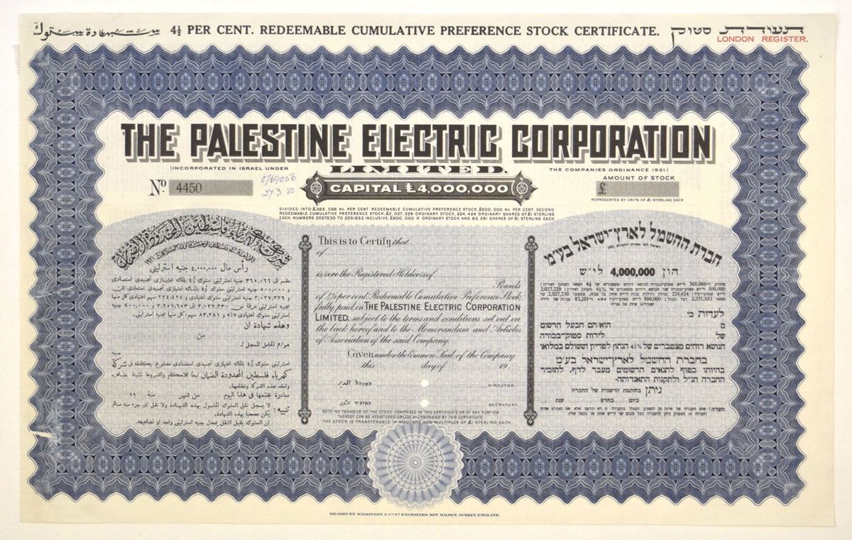 Israel, 1950. Odd Shares, Specimen 4.5% Redeemable Cumulative Preference Stock Certificate in English, Hebrew, and Arabic, Black text with blue border and undertint. POCs, VF condition with small ink notation made near serial number at top. BWC. The Palestine Electric Corporation, Ltd. was founded in 1923. In 1961 it was renamed the Israel Electric Corporation, Ltd. BW&C.
