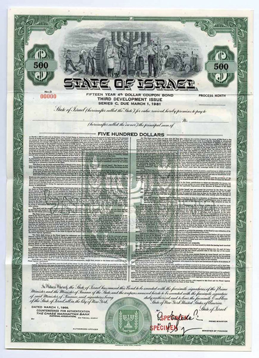 Israel. State of Israel, 1966 Specimen $500 3rd Development Issued Bond XF ABN