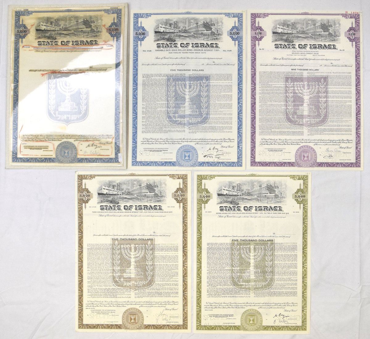 Israel, 1980-86. Lot of 5 Documents, Includes a unique $5000 Bond Mockup, Blue borders mounted onto thin white card covered with a plastic screen with archival production department red crayon notations; also included are 4 different $5000 Bonds from Various Series in Different colors, all Pin Punched Specimen. AU to CU condition. (5). Sold "AS IS" no returns accepted.