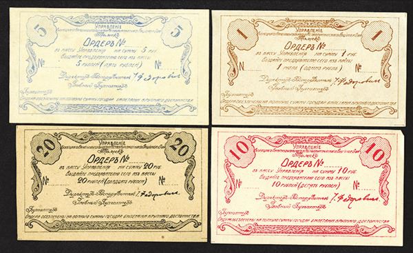 Tomsk, Russia, Lot of 4 different denominations from issuer, Includes 1; 5; 10 and 20 Rubles notes printed in different colors on light brown paper, Remainders with no serial numbers, backs blank, AU to CU condition, rarely seen private banknotes. (The Pogrebetsky Family Archives)