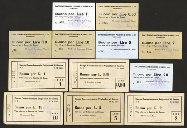Italy, Lot of 3 different camp POW notes, two of the camps have 5 notes each and one has 7 notes, Includes Camp #'s 7; 31 and 101. Campbell #'s 5795-5799; 5912-5916; and, 6190-6196, Some researchers believe that these are fantasy issues, but it is very possible that some were actually circulated in the camps. All are in AU to Uncirculated condition.