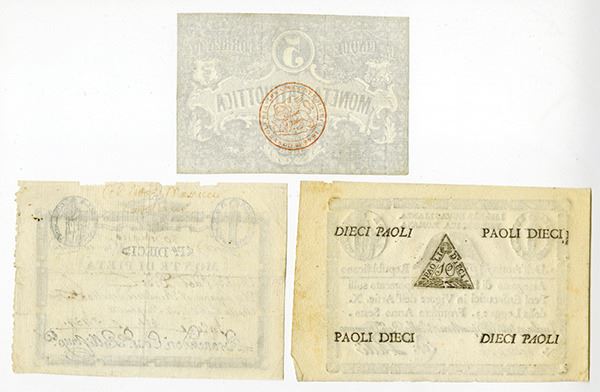Italy, includes Moneta Patriottica issue of the Venetian Republic, 5 Correnti, 1848, P-S188, Uncirculated; also from Roman Republic, all of them 10 Paoli, Anno 7 (1798), P-S540, XF with minor margin faults; and 10 Paoli, 1798, Monete di Pieta' issue, VF with minor margin faults.