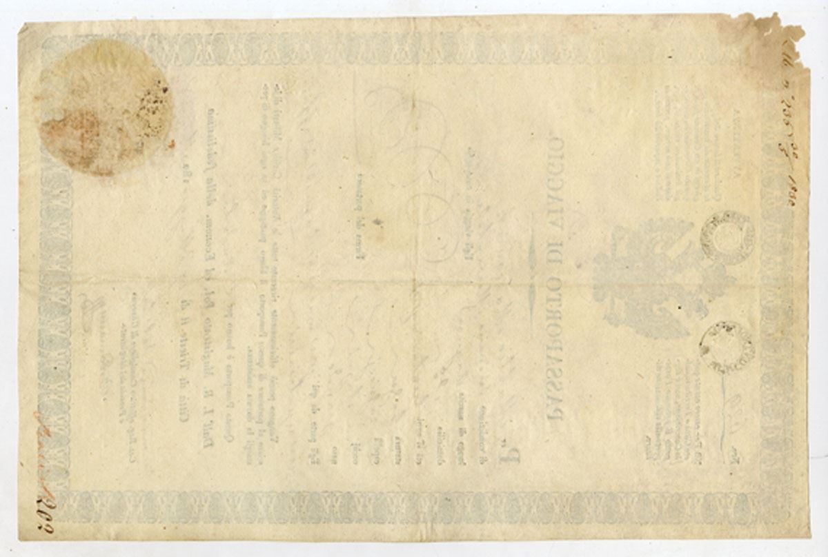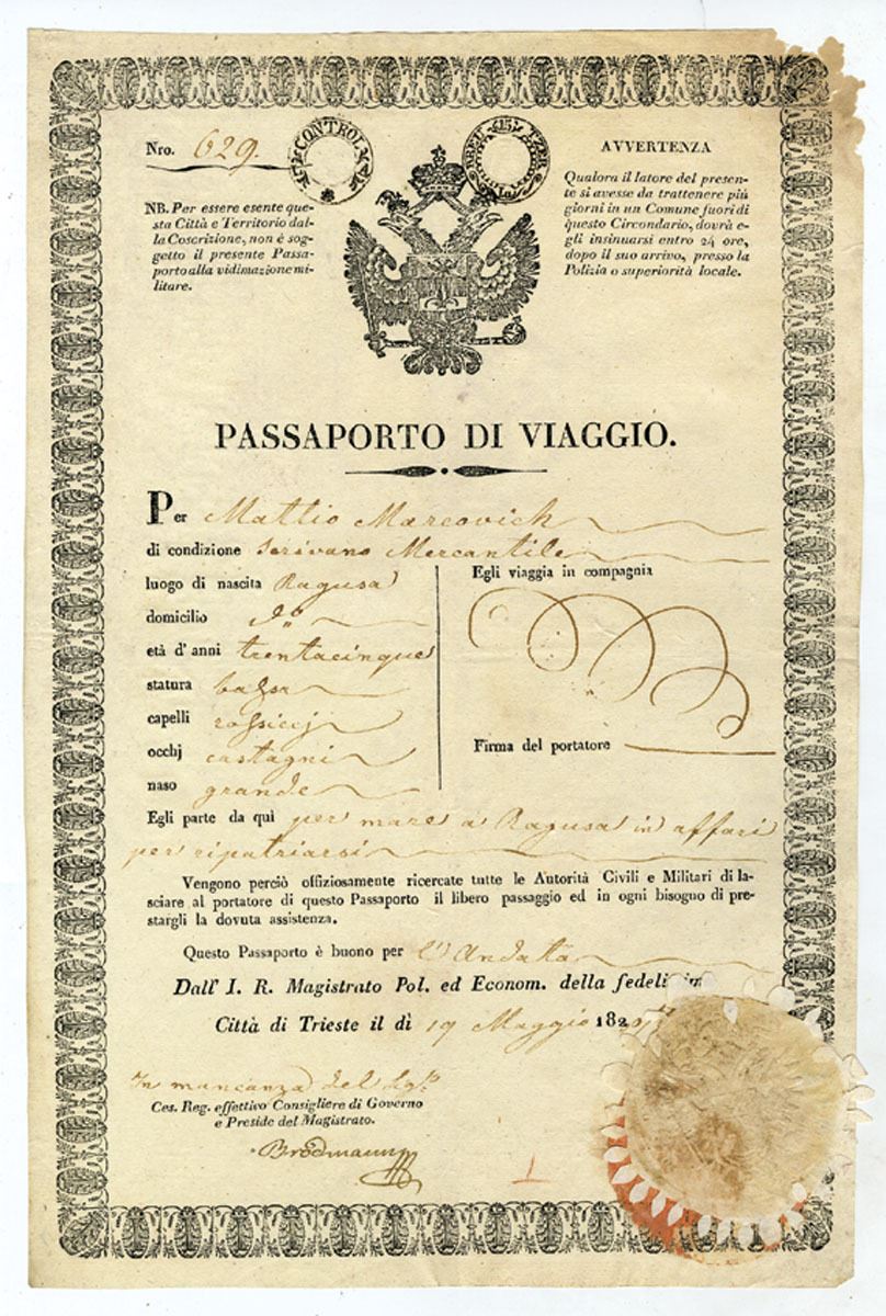 Italy, 1820-35. Travel Passport of Mattio Marcovich who was born in Ragusa, Sicily and was 35 Years Old in 1835. Date was changed from 1820 to 1835. VF condition with damage to top right corner.