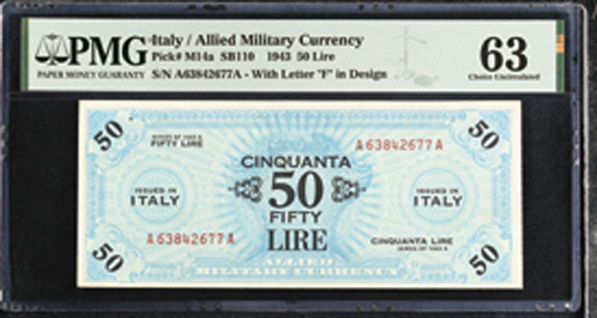 Italy, ND (1946). 50 Lire, P-M14a SB110, Issued Allied Military Banknote, Blue printing with denomination at center, Back is brown with Allied Military at center, S/N A63842677A with letter 'F' in design, PMG graded Choice Uncirculated 63 with comments "Minor Rust, Staple Holes." Only 9 graded in PMG census.