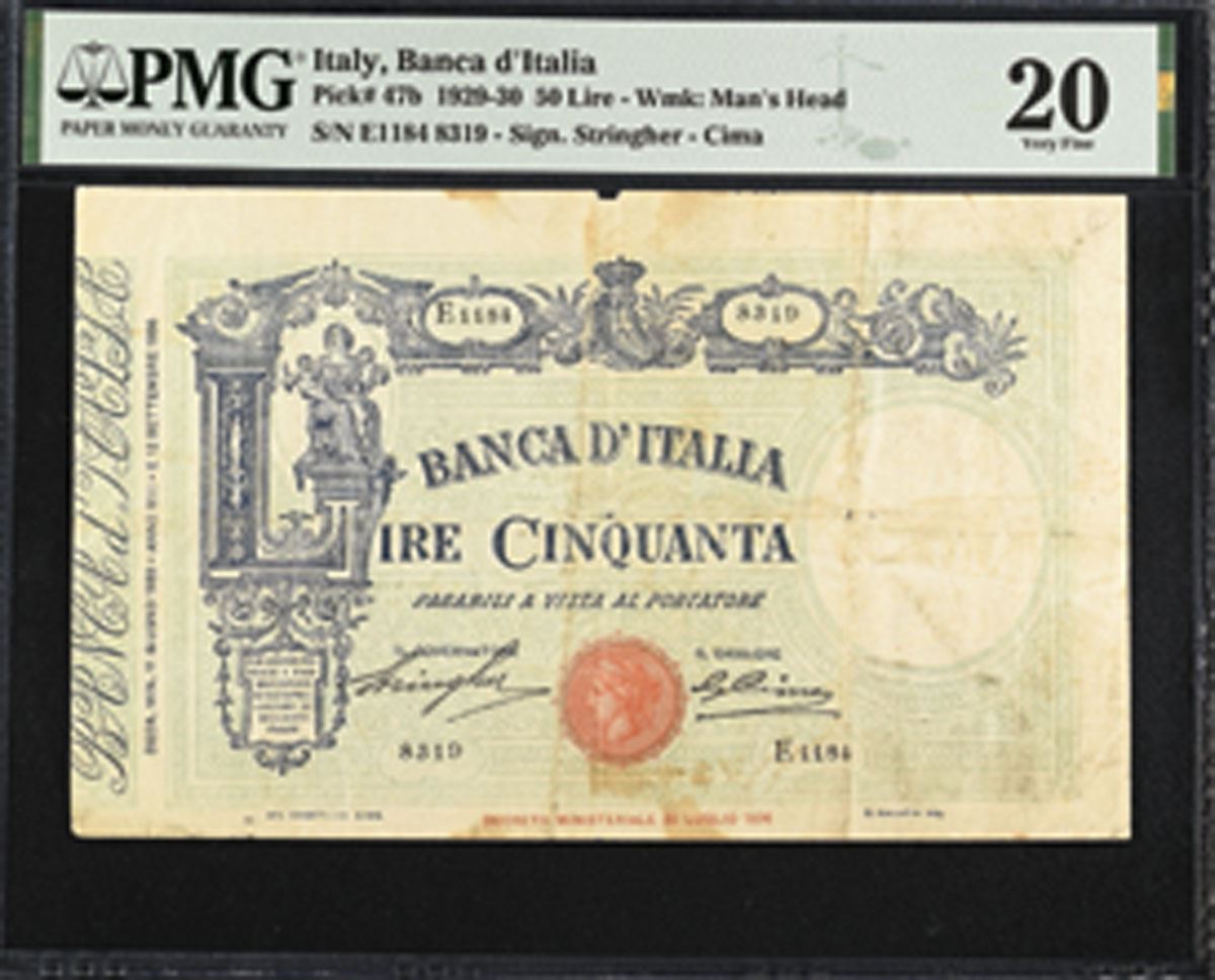 Italy, 1930. 50 Lire, P-47b, Issued Banknote, Blue on pale green underprint with Romulus and Remus at left in L, Back is blue and green with Allegorical figures, S/N E1187 8319, PMG graded Very Fine 20 with comments "Splits, Stains, Annotation."
