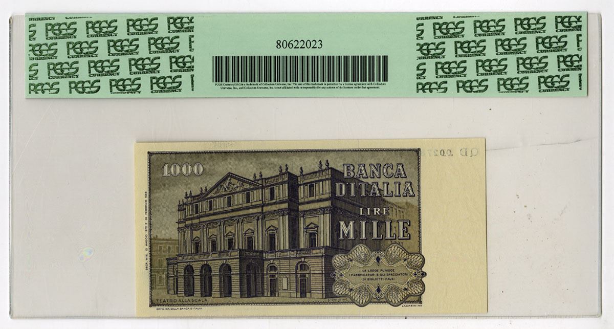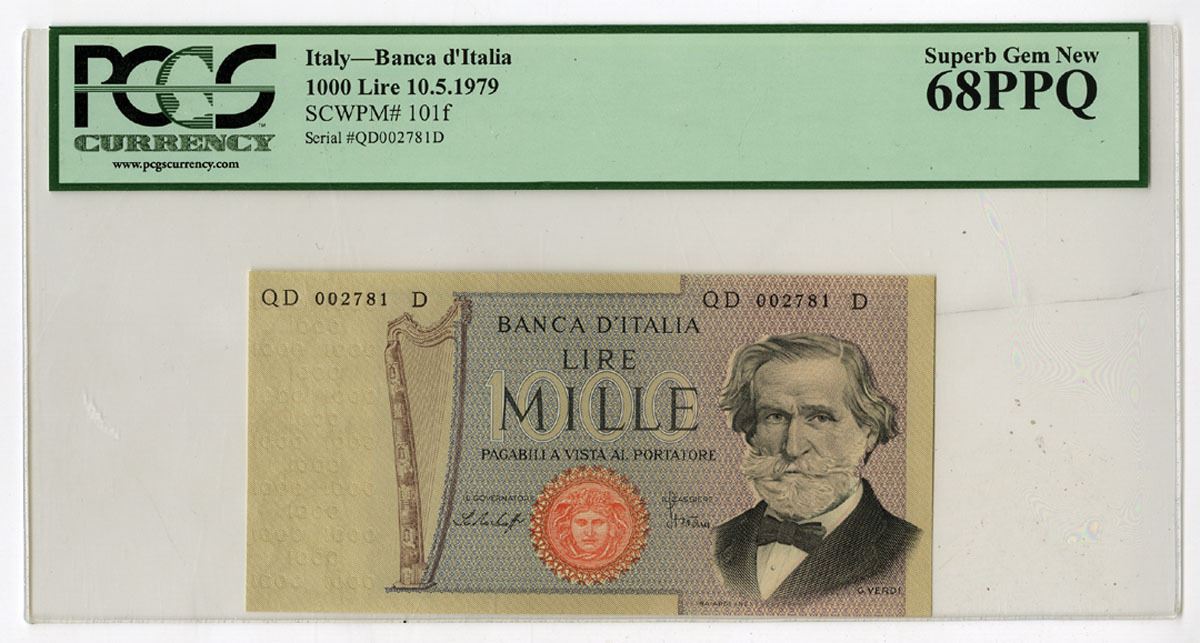 Italy, 1979.. 1000 Lire, P-101f, Issued Banknote, Black and brown on light blue and lilac underprint, Harp at left with G. Verdi at right, Back is dark brown with Milan's La Scala opera house at center, S/N QD002781D, PCGS graded Superb Gem New 68PPQ. Tied as highest graded out of 8 notes graded in the PMG census. This is also the highest graded note to be offered in the PMG census.