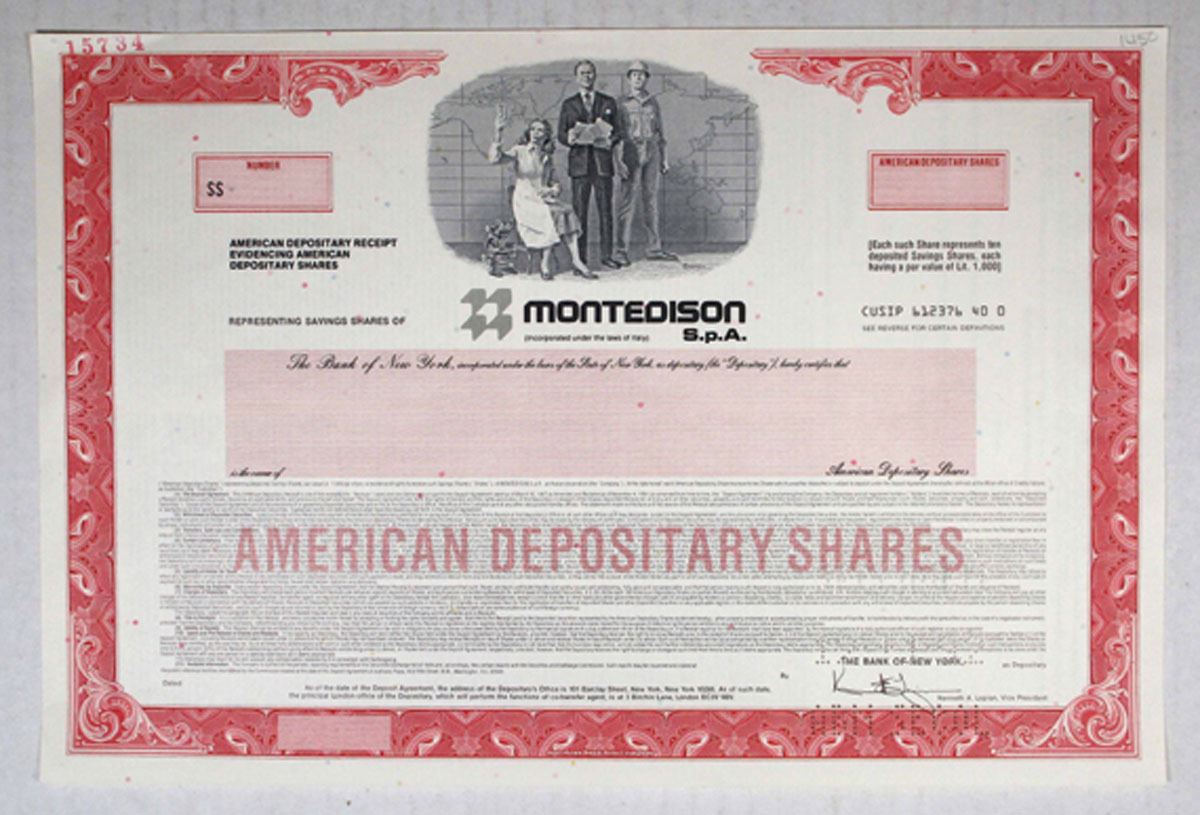 Italy. Montedison SpA, 1992 Specimen ADR Certificate, XF ABNC. Montedison , SpA, was an Italian conglomerate and stock corporation in the chemical / petrochemical , pharmaceutical, energy, paper, insurance, publishing, agro-industry, engineering services sectors.