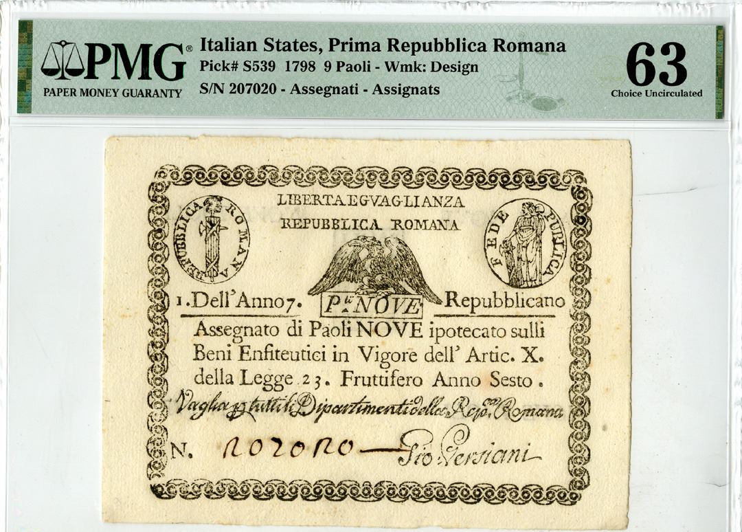 Italian States. 1798. 9 Paoli, P-S539, Issued banknote, Black print with seals at top left and right and Eagle at center, Back has black seal at center, S/N 207020, PMG graded Choice Uncirculated 63.