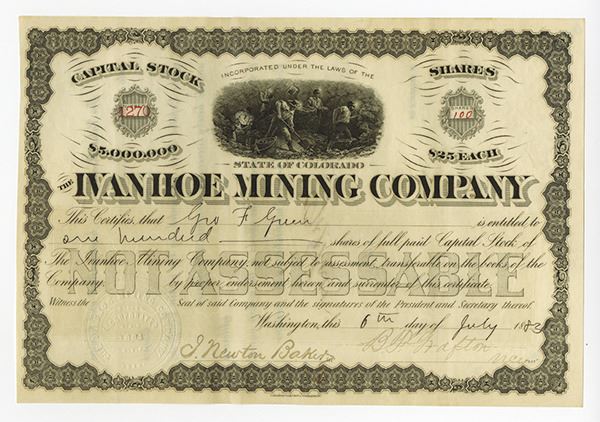 Colorado, 1883, 100 Shares, #1270, I/U stock certificate, Black border with Mining vignette, XF condition, Columbian BNC.