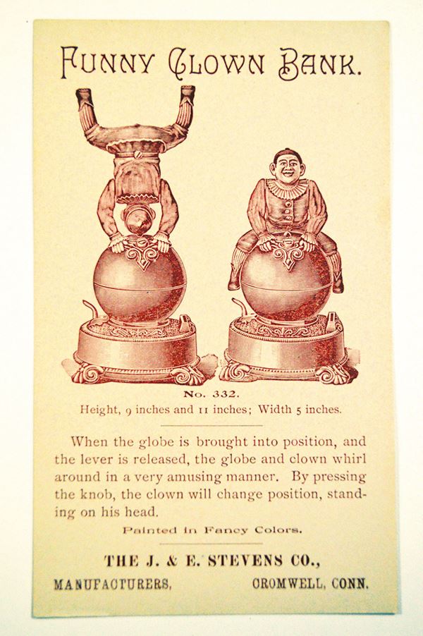 Connecticut. Card advertising #332, Funny Clown Bank. Famous Cast iron item. Mint.