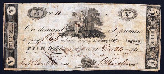 Augusta, Georgia, 181x (ca.1814-1819), $5, Unlisted, Seated allegorical woman on bales and barrels on top center, patriotic shield bottom middle, S/N 10, one very small thin on the left side of the note and one miniscule ink burn are the only detracting factors for this Fine to Fine+ condition scarce early Georgia note. Kneass, Young & Co., Philad., Kneass, the printer of this note was the second U.S. Mint engraver from 1824 to 1840.