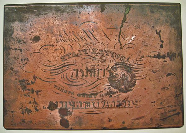 Philadelphia, Pennsylvania, ND (ca.1820's), Copper printing plate with ornate engraved text in various fonts on 5.25 by 7.5 inch copper plate. The text states "T. S. Williams, Copper Plate Printer, Opposite the Exchange, No. 86 South Third Street, Philadelphia". Unique copper printing plate from a new estate find. The plate has areas of spotting and light corrosion in a couple of areas but is still a historic and early security printer item. The back has imprint "J. Hufty Engraver. Philad." who was part of the well known firm of UBSH "Underwood, Bald, Spencer & Hufty" located in Philadelphia and well known for their early and ornate banknote engraving.