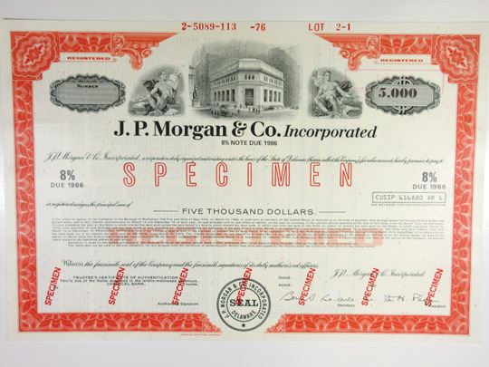 Delaware. $5000 Specimen 8% Note Registered Bond, Black print on orange border and under tint, Large building at top flanked by 2 men, Specimen overprints and POC's, Unc. condition, ABNC.