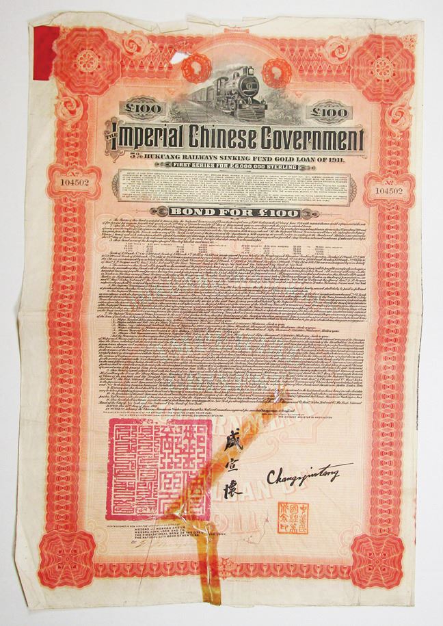 China....., 1911. £100, I/U 5% Sinking Fund Gold Coupon Bond, Black text with red border and underprint, Train approaching on tracks at top center, S/N 104502, Fine condition with damage at top and repairs made along bottom. Issued by J.P. Morgan and Co., Printer: Waterlow & Sons Ltd.