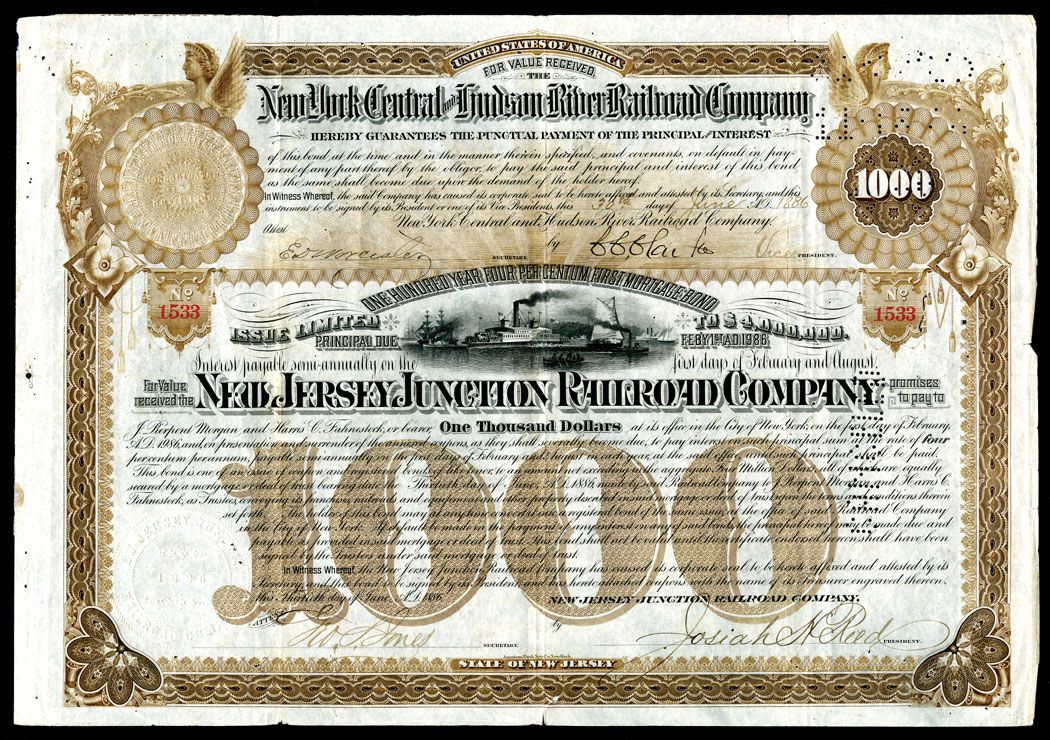 New Jersey, 1886, $1,000. 4% 1st Mortgage Bond, Issued and cancelled. Brown border w/ ferry and harbor scene vignette. Back has J.P.Morgan autograph as trustee. ABNCo. No coupons, Fine - VF . Rare autographed bond with banker who saved our financial system a little over 100 years ago, J.P.Morgan.