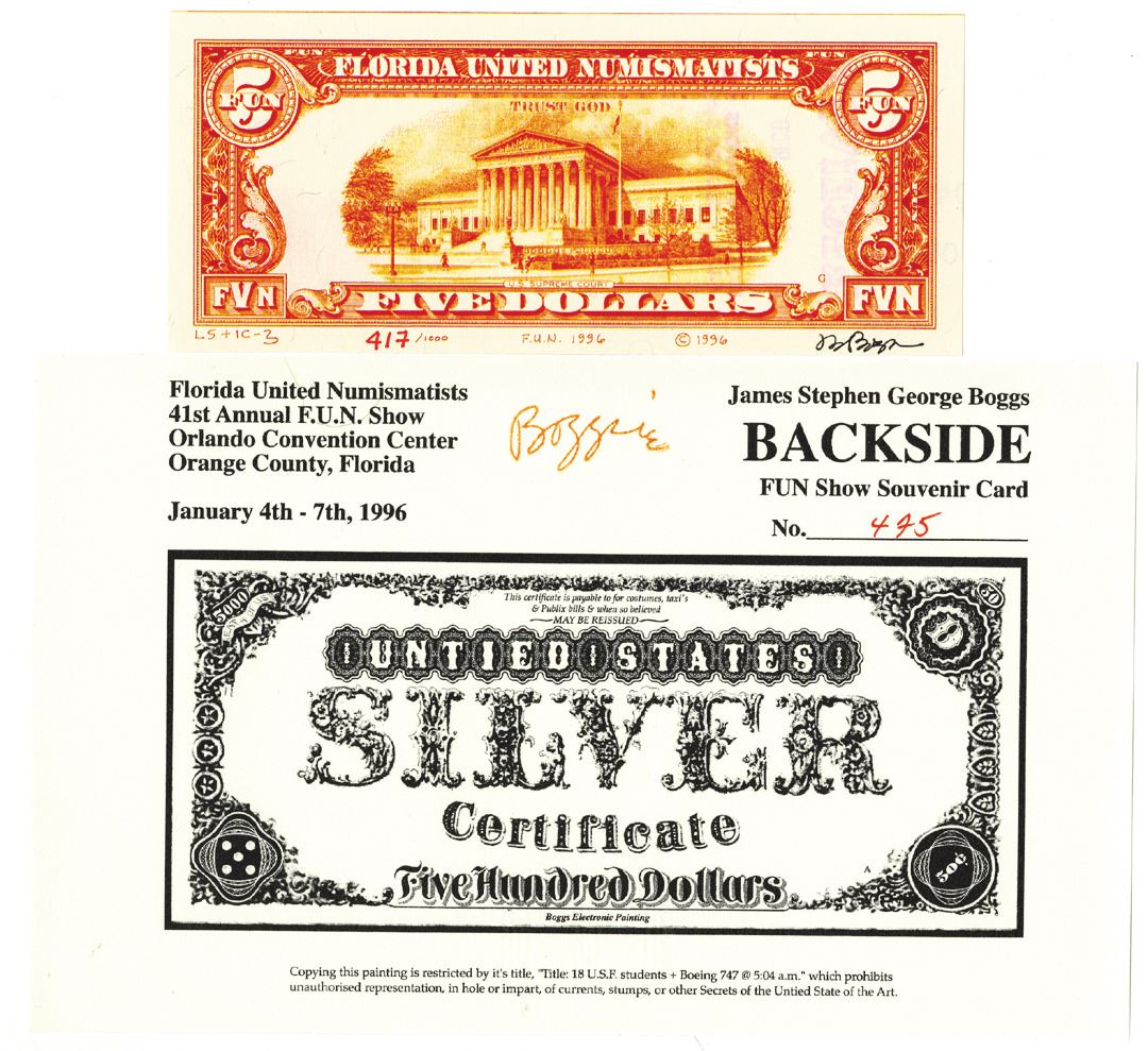 Orlando, Florida.....1996 Lot of 2 Boggs notes from F.U.N. show, One is cut down to banknote size and is the fantasy design of a $5 note in orange with hand written "417" /1000 made with J.S. Boggs signature on the lower right margin, the back has the date received by Krause Publications, Jan. 4, 1996 with a large orange thumb print of J.S. Boggs; and also a U.S. Silver Certificate back printed in black on larger card with the issue number 475 and Boggs signature on the top middle, both ar Uncirculated to CU condition. (2) (Arthur C. Matz Collection)