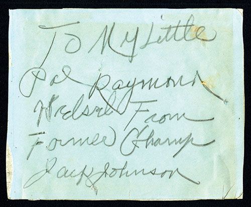 Jack Johnson signed letter on blue paper in pencil reads “To My Little Pal Raymond Helsal From Former Champ Jack Johnson, VF condition ALS. Johnson (1878-1946) became the first African American world heavy-weight boxing champion when he beat Canadian Tommy Burns on Boxing Day 1908 in Sydney, Australia in 14 rounds. Johnson was inducted into both the International Boxing Hall of Fame and the World Boxing Hall of Fame. His boxing record was 80 Wins 45 by KO 13 Losses 12 Draws 14 No Contests. He died at the age of 68 in an automobile accident after racing angrily from a diner which refused to serve him.