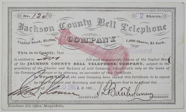 Iowa, 1881. 2 Shares I/U Capital Stock Certificate, S/N #124, 4.75 x 2.75 inches, Black text with black border, red underprint of a telephone receiver. VF condition. Very cute and small stock certificate, smaller than a flip phone.