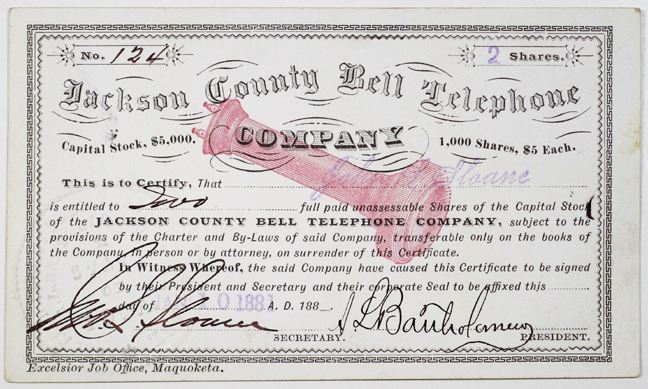 Iowa. 1881. 2 Shares I/U Capital Stock Certificate, S/N #124, 4.75 x 2.75 inches, Black text with black border, red underprint of a telephone receiver. VF condition. Very cute and small stock certificate, smaller than a flip phone. (From the Collection of John E. Herzog)