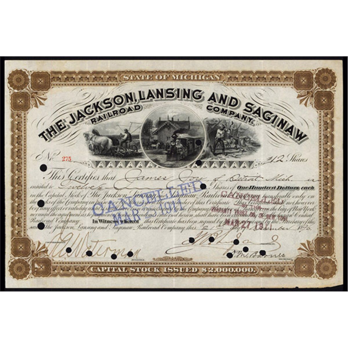 Michigan, 1896, 12 Shs., Issued and POC's, Train in circle between farmer and wood chopper, Brown border, ABNC, VF+.