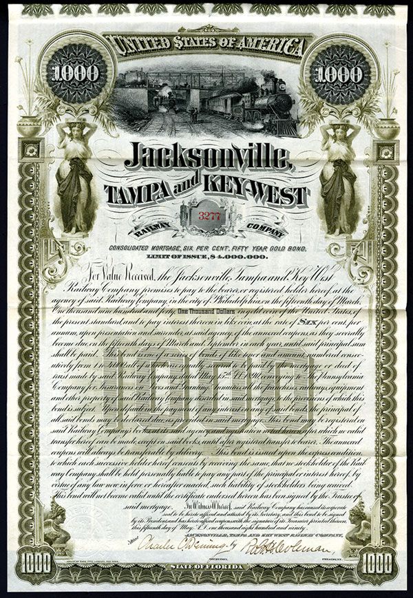 Florida, 1890, $1,000. Issued and uncancelled. 6% Consolidated Mortgage 50-year Gold Bond. Olive border with locomotive under signal towers on top with allegorical women on left and right. ABNC. Coupons. XF. Very attractive and interesting bond from this great location.