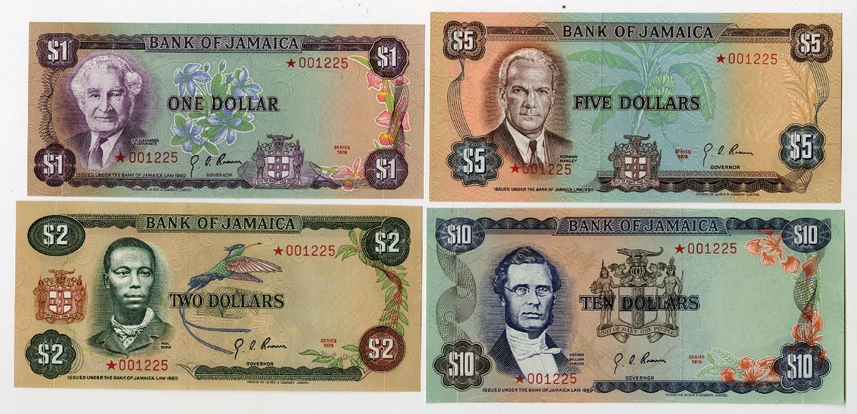 Jamaica, 1978. Lot of 4 Collector Series Specimen Banknotes, Includes: 1 Dollar, P-64CS3; 2 Dollars, P-65CS3; 5 Dollars, P-66CS3; 10 Dollars, P-67CS3. Notes all have same S/N *001225, are in AU to Uncirculated condition, and printed by TDLR. (4). Sold "AS IS" no returns accepted.