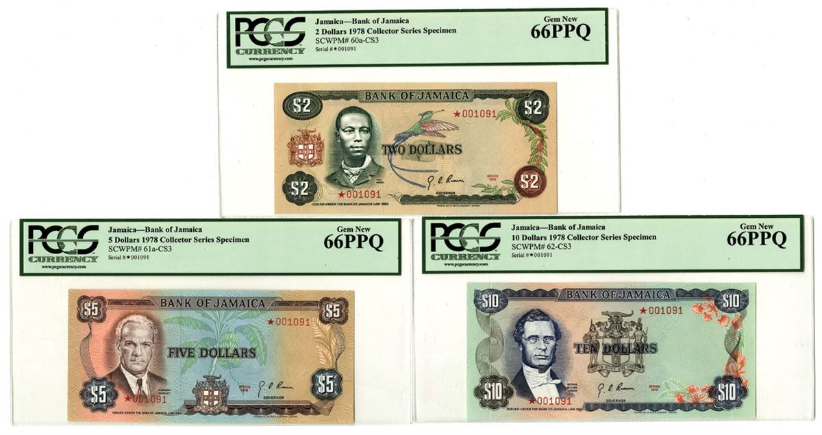Jamaica, 1978. Lot of 3 Collector Series Specimen Banknotes, Includes: 2 Dollars, P-60aCS3; 5 Dollars, P-61aCS3; 10 Dollars, P-62CS3. Notes all have S/N *001091, Specimen overprints, PCGS graded Gem New 66PPQ, and printed by TDLR. (3). Sold "AS IS" no returns accepted.