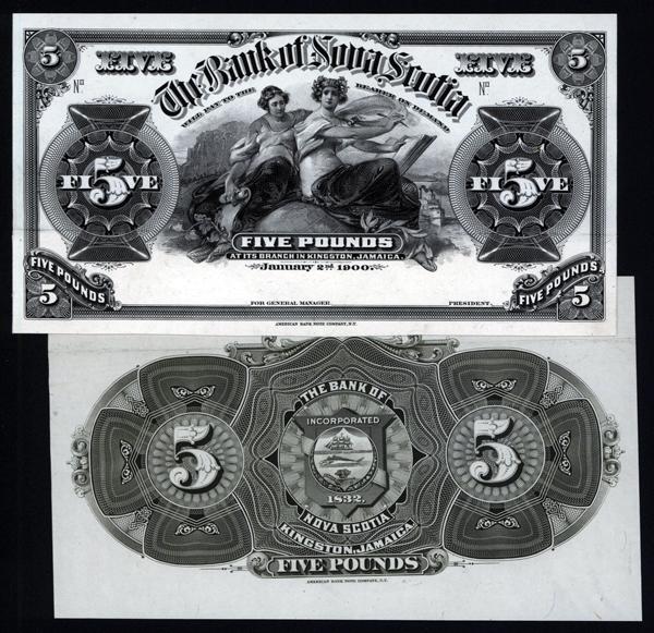 Kingston, Jamaica, January 2nd, 1900. $5, P-S132a, Unlisted proof. Face and back proofs printed on india paper, Face is printed in Black with no underprint, Seated allegorical women sitting on globe with the back of the face proof with a strip of card on bottom 1/3rd, back black with bank arms, both cut down to banknote size. The face of the Note appears in Uncirculated condition but there is a horizontal bend on the bottom 1/4 of the note, the back has wavy paper with a horizontal bend on the top 1/4 of the note. Unpriced in SCWPM and very attractive and rare. ABNC.
