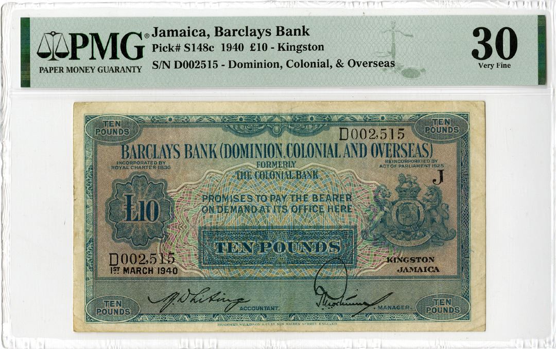 Kingston, Jamaica, 1st March 1940. Barclays Bank (Dominion, Colonia; and Overseas) Formerly "The Colonial Bank", £10 Pounds, Series J, P-S148c, Issued Banknote. Blue and mauve underprint with arms at right. Black S/N D002,515, back similar colors with Supported Royal Arms in middle, PMG graded Very Fine 30. Printer: BWC. Only 1 note grades higher out of 11 notes graded in the PMG census.