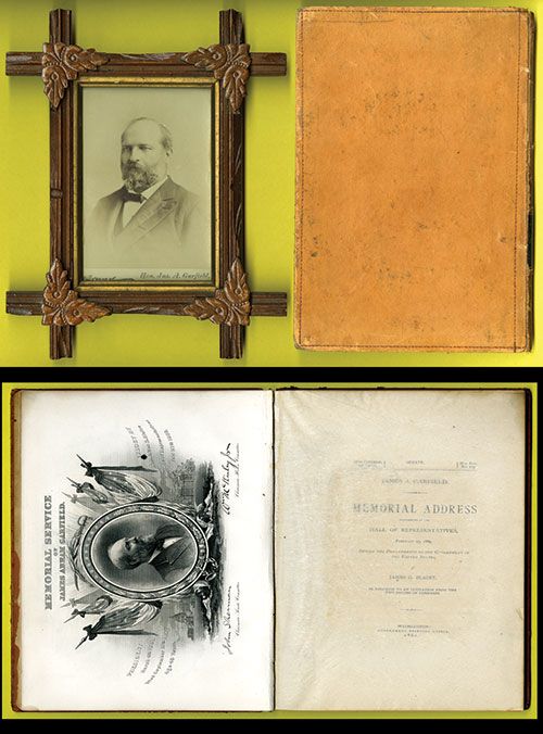 1881. Garfield memorial Book with Memorial card printed by the BEP, the book has leather binding with the front cover partially detached, but the card is in excellent condition and still attached to the book which could be repaired if desired, Also included is an original cabinet card in it's original frame in excellent condition. Scarce pair of Garfield items.